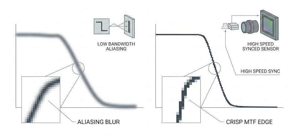 示意圖中為在測試高解析度陣列時,頻寬不足與時間遲滯會引發嚴重的空間混疊失真。透過具備超低延遲同步介面與超高幀率的相機,方能擷取最銳利、精確的 MTF 邊緣參數