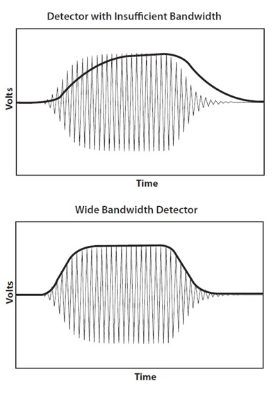 功率計的前端是射頻封包檢測器,它安裝在功率感測器中,該檢測器移除射頻載波並產生代表射頻輸入訊號封包的類比波形,檢測器最關鍵的技術規格是其對脈衝射頻訊號的反應時間,或稱其上升時間,如果檢測器沒有足夠的頻寬來追蹤訊號的封包,則所有量測(包括峰值功率脈衝功率平均功率)的準確性都會受到影響 (圖 2)。