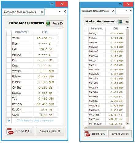 在量測能力方面,峰值功率計可執行眾多手動、自動標記和自動脈衝量測,自動脈衝量測 (圖 4) 提供了許多關鍵參數的量測值,有助於特性分析功率放大器和雷達系統的效能,上升時間下降時間指出放大器輸出脈衝射頻訊號的能力,過衝則指出了潛在的振鈴問題,下垂顯示了放大器電源在長時間脈衝寬度下的限制,脈衝寬度週期脈衝重複率工作週期量測則提供了訊號的其他時域特性,此外還有許多自動標記量測 (圖 4 右側),可實現時間閘控量測,這些量測在兩個標記之間執行,並提供平均功率峰值功率最小功率最大功率讀值,以及峰均比、功率位準的差值標記和時間的差值標記量測。