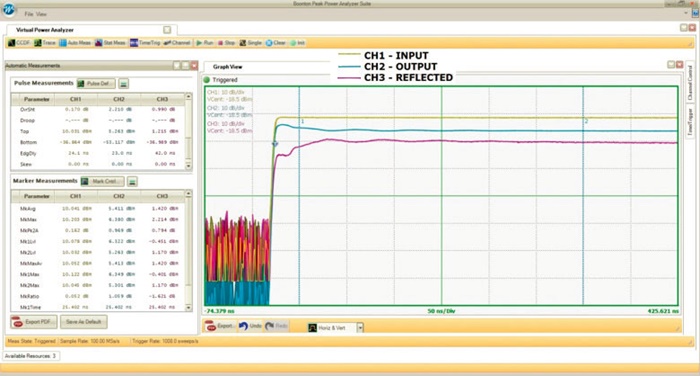 圖 8 顯示了使用圖 7 中的測試配置,並運用 55 系列峰值功率感測器量測到的三個波形,輸入波形顯示在 CH1,反射波形顯示在 CH3,輸出波形顯示在 CH2,請注意,在所有三個通道上執行的自動量測結果顯示在軌跡顯示視窗的左側,這些量測結果可以傳輸到試算表,以執行必要的增益回波損耗計算,以及其他感興趣的參數,在自動化測試環境中,也可以透過遠端編程存取相同的量測結果,以執行增益回波損耗的計算,圖 9 使用 Boonton 55318 USB 峰值功率感測器展示了下垂量測功能,功率下垂可以使用自動脈衝量測或自動標記量測以及水平標記來量測,自動標記量測可以透過在波形上期望的點放置標記並使用 MkRatio 來顯示下垂,或者,可以在垂直軸上期望的脈衝高點和低點放置參考線來量測下垂,自動脈衝量測是依據脈衝定義自動計算的,與標記或參考線的位置無關。