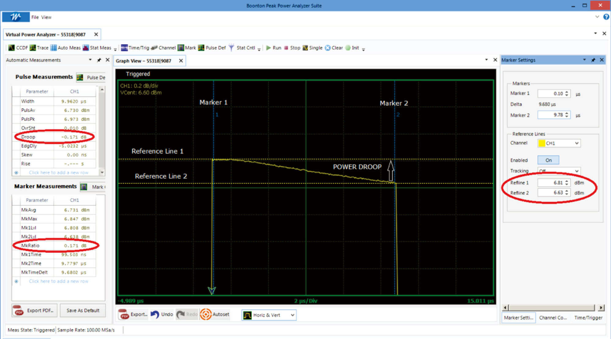 圖 9. 使用 Boonton 55318 USB 峰值功率感測器進行的下垂量測,藍色垂直線 1 和 2 是為自動標記量測放置的標記,黃色虛線水平線是參考線,自動脈衝量測是依據脈衝定義自動計算的,與標記或參考線的位置無關。