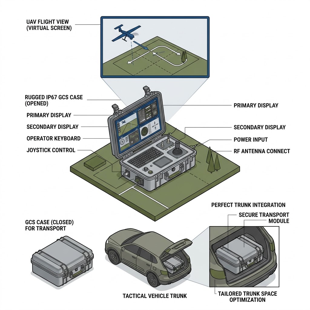 野外環境充滿了不可預測的物理挑戰,包含沙塵、高濕度與搬運過程中的震動,該 GCS 系統採用了具備輪座的手提箱結構(Wheeled bag type structure),整體重量控制在約 30 公斤(含電池約 30.25 公斤),這使得兩名操作人員可以輕鬆透過提把進行搬運,或由單人使用滑輪在平坦地面拖行,其外殼具備 IP67 級別的防水防塵能力,確保系統在關閉狀態下,能夠抵抗嚴苛的天候侵襲,完美適應各種野外戰術集結區的存放標準。