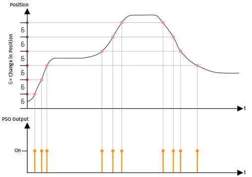 圖 1. 此圖描繪 PSO 脈衝輸出是依據移動距離的變化量,而非經過的時間量。