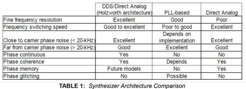 實現寬頻射頻合成架構有多種方式,根據不同的應用需求,需要考量不同的技術權衡;表 1 比較了三種常見架構的主要合成器參數,包括 直接數位/直接類比(DDS/Direct Analog, Holzworth 採用的方法)、鎖相迴路(PLL-based)、以及類比(Analog)。