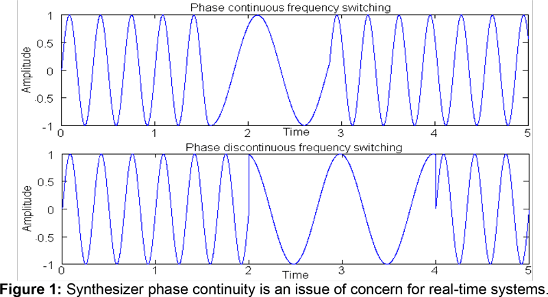 圖 1 為 相位連續(Phase Continuous) 與 相位不連續(Phase Discontinuous) 之間的基本差異,在第一個範例中,訊號為相位連續,因為沒有突然的振幅跳變(amplitude jumps),且當頻率變更時,新頻率的相位能夠與舊頻率的相位無縫銜接。