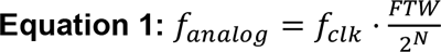 DDS 的輸出頻率由數位時脈頻率與頻率調諧設定值(FTW)決定,其關係可由下面方程式計算。