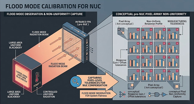 在紅外線焦平面陣列(FPA)或熱像儀的標準出廠流程中,「非均勻性校正(Non-Uniformity Correction, NUC)」是不可或缺的物理平坦化步驟,此程序的基礎在於,陣列中的每一個像素對紅外輻射的響應增益與偏移皆存在微觀的半導體製造公差,為了擷取這些公差並進行數位補償,系統必須在泛光模式(Flood Mode)下,觀測一個大面積且溫度絕對均勻的黑體輻射源。