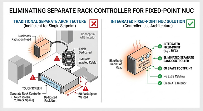在典型的自動化檢測機台內部,三維空間極為珍貴,傳統的高精度黑體通常採用「黑體輻射頭」與「19 吋機架式控制器」分離的架構,兩者之間需透過粗重的專用電纜進行類比或數位訊號傳輸,若產線僅需要執行單一固定溫度的 NUC 校正(例如攝氏三十度),配置一台具備觸控螢幕、佔用 2U 機櫃空間的獨立控制器,在工程資源上屬於嚴重的空間浪費;此外,多餘的通訊纜線與電源線會增加 ATE 機台內部的走線複雜度,並提高電子零組件之間的電磁干擾(EMI)風險。