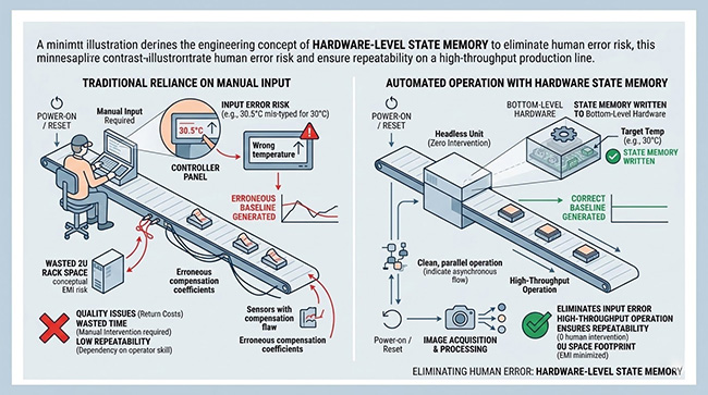 工廠產線經常面臨換線、設備重啟、斷電或每日的例行開關機,若測試設備缺乏硬體層級的狀態記憶機制,操作員每次開機後都必須重新透過軟體介面或控制器面板,輸入 NUC 所需的目標溫度,這種依賴人工反覆介入的流程不僅耗時,更引入了高風險的「人為輸入誤差」。若操作員誤將溫度設定偏差了零點五度,整批出廠的感測器 NUC 補償係數將基於錯誤的物理基準生成,導致嚴重的品質異常與後續的退貨成本,高通量產線需要的是一種能夠將狀態寫入底層硬體的「盲端(Headless)」運作機制。
