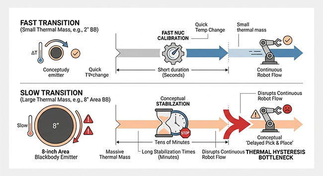 為了覆蓋廣角鏡頭或大尺寸焦平面陣列,NUC 測試通常需要孔徑達八英吋的延伸面積黑體,大面積的物理特性意味著龐大的金屬熱質量(Thermal Mass),當產線需要從常溫加熱至特定高溫,或在兩點 NUC 測試中進行溫度切換時,若黑體內部的熱電冷卻器(TEC)功率密度不足,溫度的轉換與穩定往往需要耗費數十分鐘,這種物理上的熱遲滯會打斷自動化機械臂的連續取放節奏,成為整段檢測製程中最明顯的時間瓶頸。