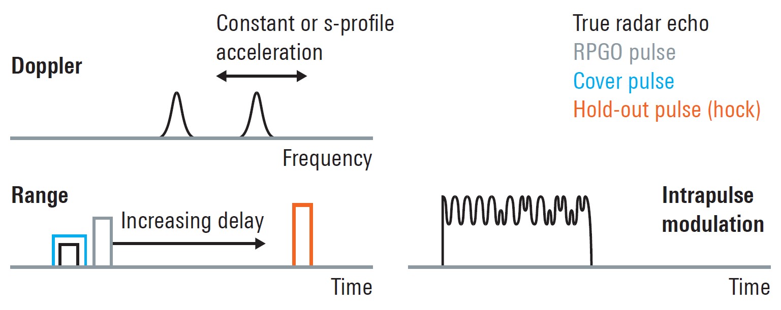 透過逐漸增加重播訊號的延遲,讓敵方雷達誤以為目標正在遠離,從而丟失鎖定。 - 速度欺騙(Velocity Deception):