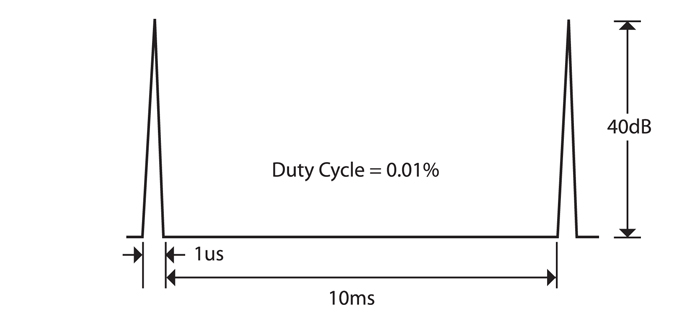 圖二、此圖強調脈衝雷達訊號的低佔空比特性;圖示兩個 1 µs 的短脈衝,其間隔為 10 ms,佔空比僅 0.01%;垂直軸顯示 40dB 的功率範圍,低佔空比導致高峰值平均功率比,說明為何需用峰值功率感測器進行精確量測。