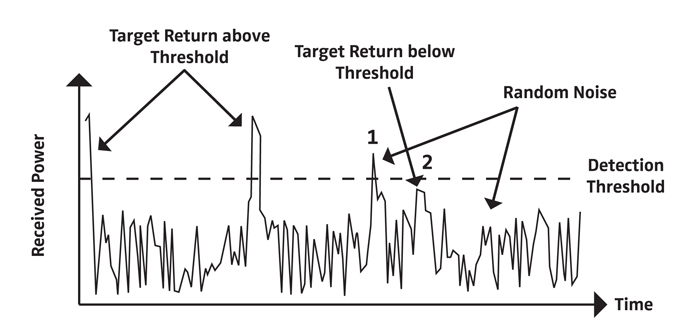 圖三呈現了脈衝雷達系統的典型回波訊號,其中包含目標特徵、隨機雜訊和確定性的假警報,為了區分真實目標與雜訊,必須設定明確的閾值,可以感測到的最小功率值 Smin,等效於雷達接收器的最小可偵測訊號 (MDS),計算 MDS 是確定系統最大偵測範圍 (MDR) 的前提,圖三中的點 1 代表一個假陽性,此時雜訊高於測試閾值;而點 2 則代表一個低於閾值而未被偵測到的目標回波,值得注意的是,最新的數位訊號處理 (DSP) 電路,可透過平均共模雜訊並關聯高於 MDS 的確定性事件,來解決部分上述問題,驗證系統是否具備此項正常運作的能力至關重要。