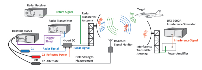 因為實際發射功率 (Pt) 對雷達系統的最大偵測距離有顯著影響,雷達發射器產生一個輸出觸發脈衝(紫色),除主功率量測通道外,此脈衝可用作功率計的外部觸發輸入,以同步系統量測,接收器亦可類似地透過第二個觸發通道作為外部觸發輸入,功率計可利用發射器或接收器的外部輸入,觸發單個脈衝或複雜的事件序列,功能類似於數位示波器,接收器系統會受到干擾模擬器訊號(紅色)的擾動,以模擬無意的無線干擾或蓄意的干擾,即「阻斷」,此干擾模擬器為複雜的系統測試提供多功能且可重複的干擾。
