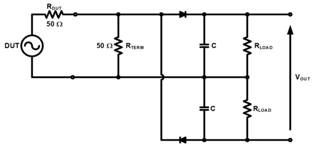 在此區域,二極體感測器的整體行為更像一個峰值偵測器,有時也被稱為封包偵測器,它能夠捕捉並反映輸入射頻訊號的峰值功率或封包功率,這對於分析具有高峰均功率比 (PAPR) 的訊號,如雷達脈衝或多載波通訊訊號至關重要,其直流輸出電壓在理想情況下將約等於峰對峰射頻輸入電壓減去兩個二極體因正向導通所產生的固有壓降 (diode drops)(此為典型橋式或倍壓偵測電路結構的特性)。
