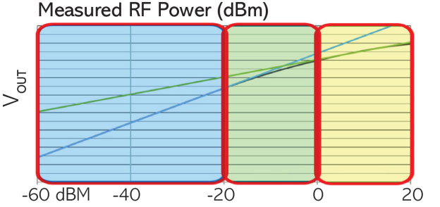 二極體功率感測器的轉換區,是介於低功率的平方律區與高功率的線性區之間的一個過渡操作範圍,其大致的功率位準範圍約從 -20 dBm 延伸至 0 dBm, - 量測精確度的關鍵: