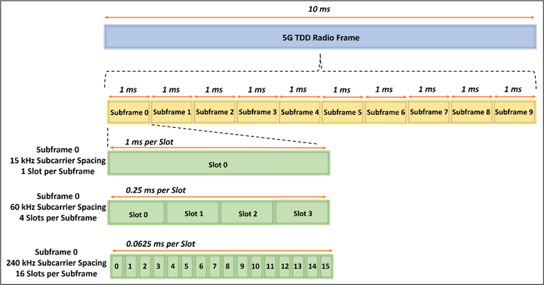 圖 1:一個 10 ms 的 5G TDD 無線電訊框的詳細分解,展示其如何劃分為 1 ms 的子訊框,以及在 15 kHz、60 kHz 和 240 kHz 不同子載波間距下的多樣化插槽配置。