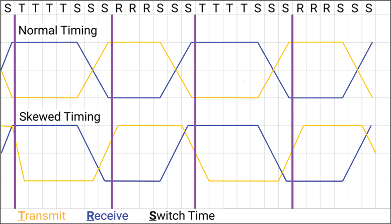 圖 3:理想的 TDD 交換器時序展現出極高的精準度,其發射(黃色)與接收(藍色)操作的交遞過程在指定的延遲幀內均勻且平滑地發生;相較之下,由傳播延遲等因素引起的時序偏斜,則可能導致嚴重的切換重疊與前導資料錯誤等挑戰。
