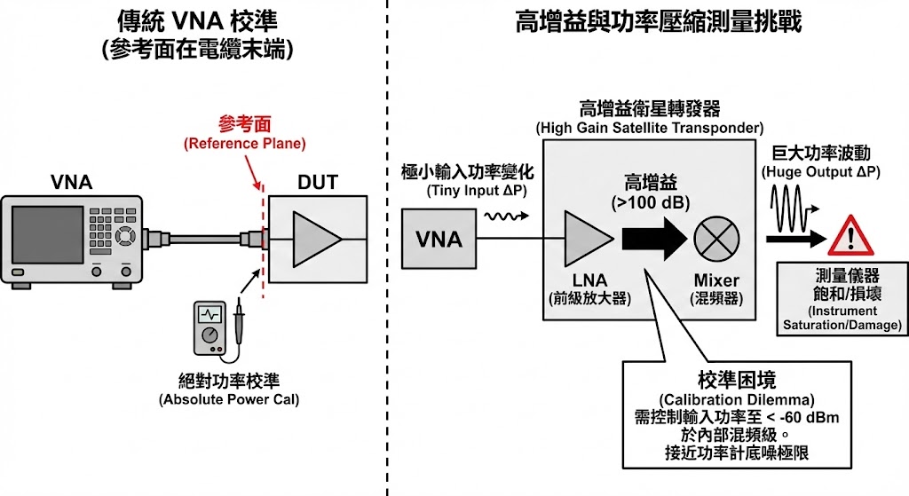 - 校準困境:傳統的 VNA 校準將參考面設定在電纜末端。然而,為了測量增益壓縮,必須精確控制輸入到轉換器「內部」混頻級的功率,而非僅是模組介面的功率。當模組包含前級放大器(LNA)時,輸入功率必須控制在極低的範圍(如 -60 dBm),這已接近許多功率計的底噪極限,使得絕對功率校準變得異常困難。