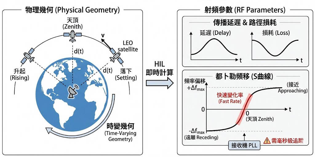 相對速度的變化率更為劇烈,當衛星從地平線升起,接近地面站,再從另一端落下,其相對速度會經歷從正最大值、過零點(通過天頂時)、到負最大值的過程,這在頻譜上表現為一個特徵鮮明的「S 曲線」頻率偏移;HIL 系統必須在毫秒級的時間解析度下,精確計算並施加這個頻率變化,否則接收機的鎖相迴路(PLL)將會失鎖。
