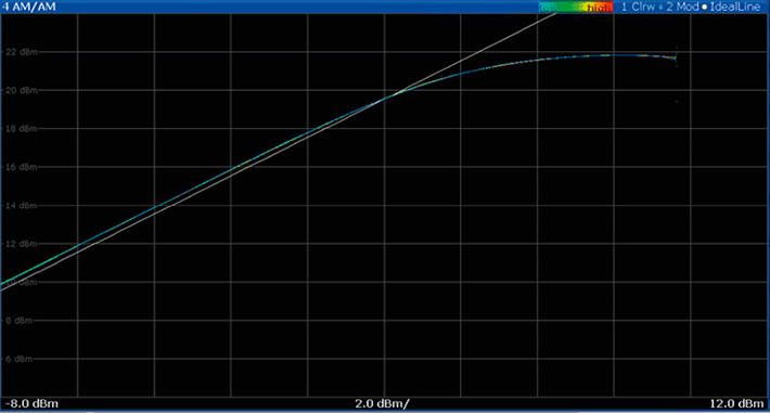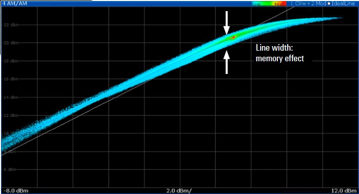 放大器的增益轉移曲線量測 (AM/AM),上方的曲線是使用 R&S SMW200A 數位基頻的 CW 功率斜坡掃頻 (ramp sweep) 作為激勵源,正如預期的,AM/AM 曲線是一條直線;右側的曲線是使用 R\&S SMW200A 產生的數位調變訊號量測的,AM/AM 呈現雲狀曲線;曲線的寬度是由放大器的記憶效應所致。