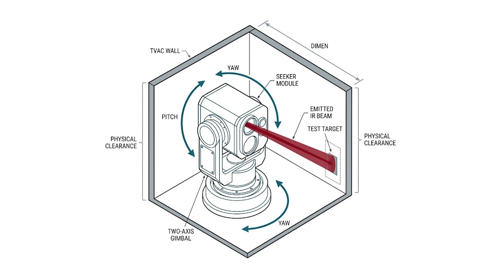 軍規 IR 尋標器動態測試示意圖:展示雙軸雲台於 TVAC 受限空間內之俯仰、偏航運動與紅外光束發射,強調精密工程細節與物理間隙。