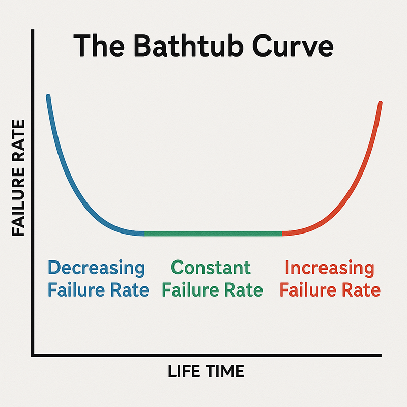 為了系統性地理解和預防這些故障,半導體產業普遍採用「浴盆曲線」(bathtub curve)模型來描述產品的生命週期故障率。此曲線分為三個階段:早期失效期(infant mortality)、偶然失效期(useful life)和耗損期(wear-out);早期失效通常源於製造過程中的隨機缺陷;偶然失效期代表產品穩定運行的階段,故障率較低且恆定;耗損期則是材料和元件因老化而開始系統性失效的階段,可靠性測試的核心目標,正是透過加速老化的手段,在產品出廠前識別並消除這三個階段的潛在失效模式,從而確保其在預期壽命內能夠穩定運行。