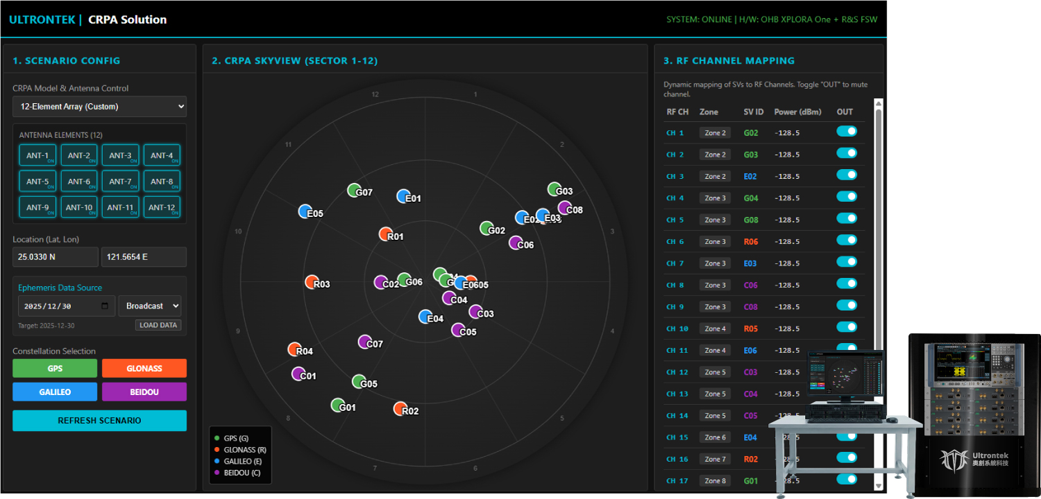 奧創系統提供一站式 CRPA 抗干擾測試方案,整合 OHB XPLORA One 與 R&S FSW,支援 4-16 元件波前模擬、暗室與戶外場域驗證,針對 GNSS 干擾與欺騙 (Spoofing) 威脅,提供客製化戰場情境模擬與零陷 (Nulling) 效能分析。