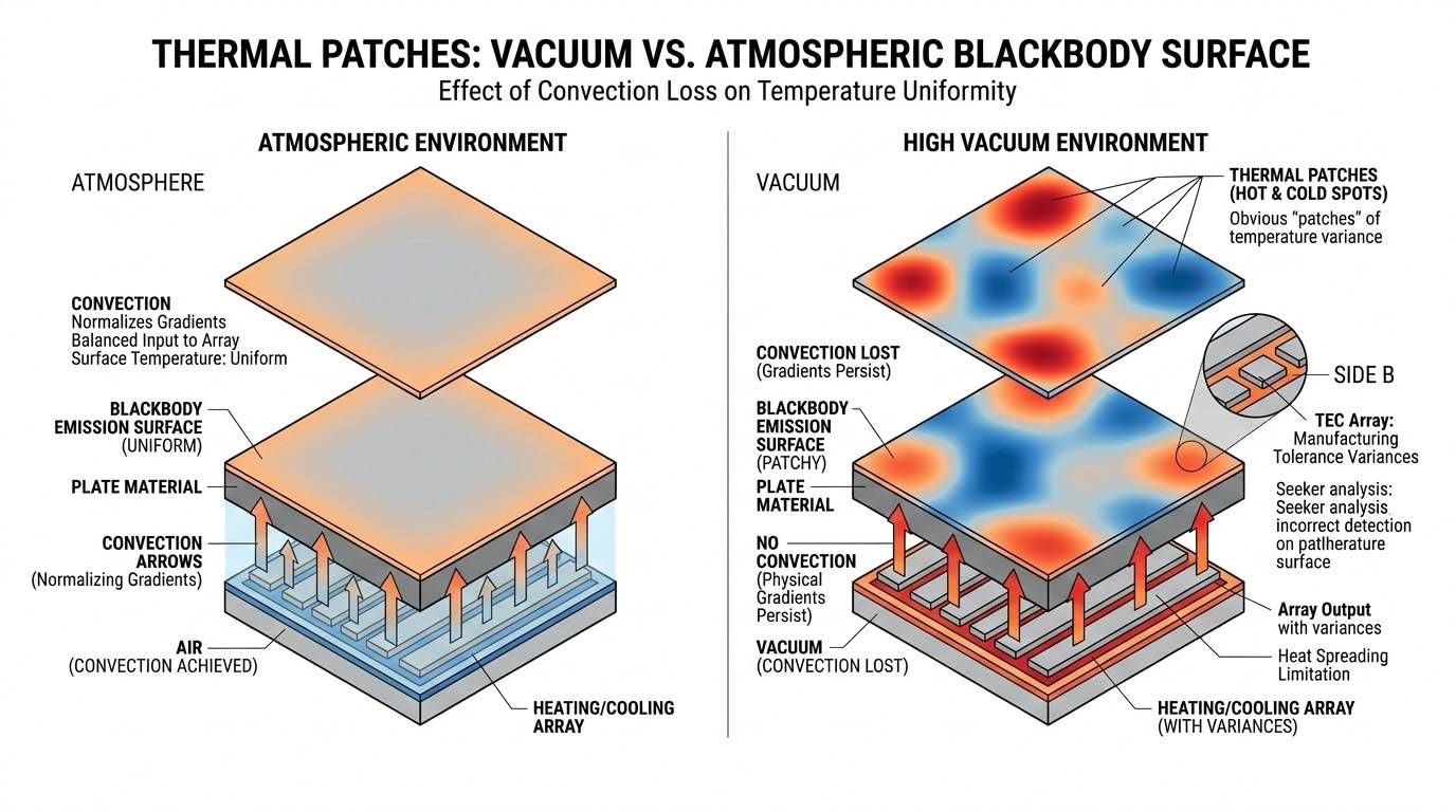 在常溫常壓的實驗室中,黑體輻射板表面的微小溫度不均,可以部分藉由周遭空氣的微對流來達到熱平衡,但在高真空環境下對流效應完全消失,這表示黑體背板加熱或制冷陣列所產生的任何物理熱梯度,都將直接、毫無修飾地傳導至發射表面,若輻射板的材料熱傳導率不足,或是熱電冷卻器(TEC)的分佈存在微小公差,輻射表面將出現明顯的「冷熱斑塊」。