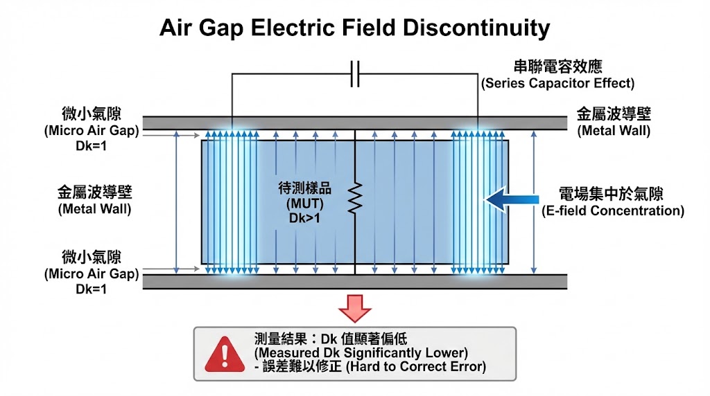 這是傳輸線法(特別是波導法)最難克服的物理問題,在矩形波導中,電場通常垂直於寬邊分布,當我們將固態樣品放入波導時,樣品與金屬壁之間不可避免地會存在微小的空氣間隙,根據電磁場邊界條件,電場在垂直跨越「金屬-空氣-樣品」介面時,空氣隙會形成一個串聯電容,由於空氣的介電常數 (Dk=1) 遠低於樣品,電場會集中在氣隙中,導致量測到的 Dk 值顯著偏低,即便氣隙小至微米等級,也會對量測結果造成巨大誤差,且這種誤差極難透過軟體完全修正。