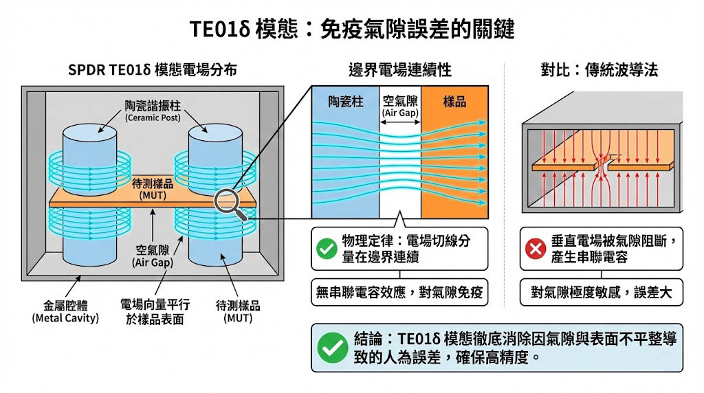 SPDR 設計中最精妙之處在於它運作於 TE01δ 模態,在這個模態下,電場線呈現 同心圓狀 (Azimuthal) 分布,意即電場向量與樣品表面是 「平行」 的,物理學告訴我們,電場的切線分量在介質邊界是連續的,這表示樣品與上下金屬腔體(或陶瓷柱)之間的空氣隙,並不會阻斷電場,也不會像波導法那樣產生串聯電容效應,因此 SPDR 對於樣品表面是否完全平整、或是否存在微小氣隙具有極高的免疫力,這一特性徹底消除了人為操作中最不可控的誤差來源。