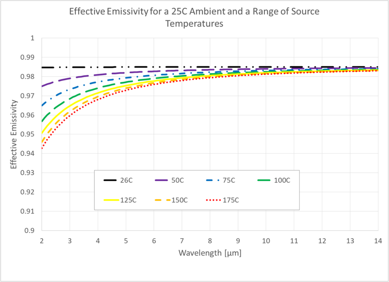 然而,隨著源溫度與環境溫度的差異增大,有效發射率在較短波長處開始發生顯著的變化,例如,當源溫度達到175°C時,在中波紅外波段 (3-5μm) 的有效發射率與其在26°C時的有效發射率相比,差異已接近2%;許多輻射校準程序為了提高訊噪比,特別是在短波段,往往選擇在較高的溫度下進行;如果在上述情況中,一個系統在175°C下進行校準並得到一個有效發射率值,然後再用這個在175°C下得到的有效發射率去推算其在接近環境溫度(例如26°C,即比25°C環境高1°C)下的輻射特性,那麼預期將會產生高達2%的輻射量測誤差。更進一步說,如果該系統在一個與其校準時顯著不同的環境溫度下使用,同樣也會引入額外的誤差。
