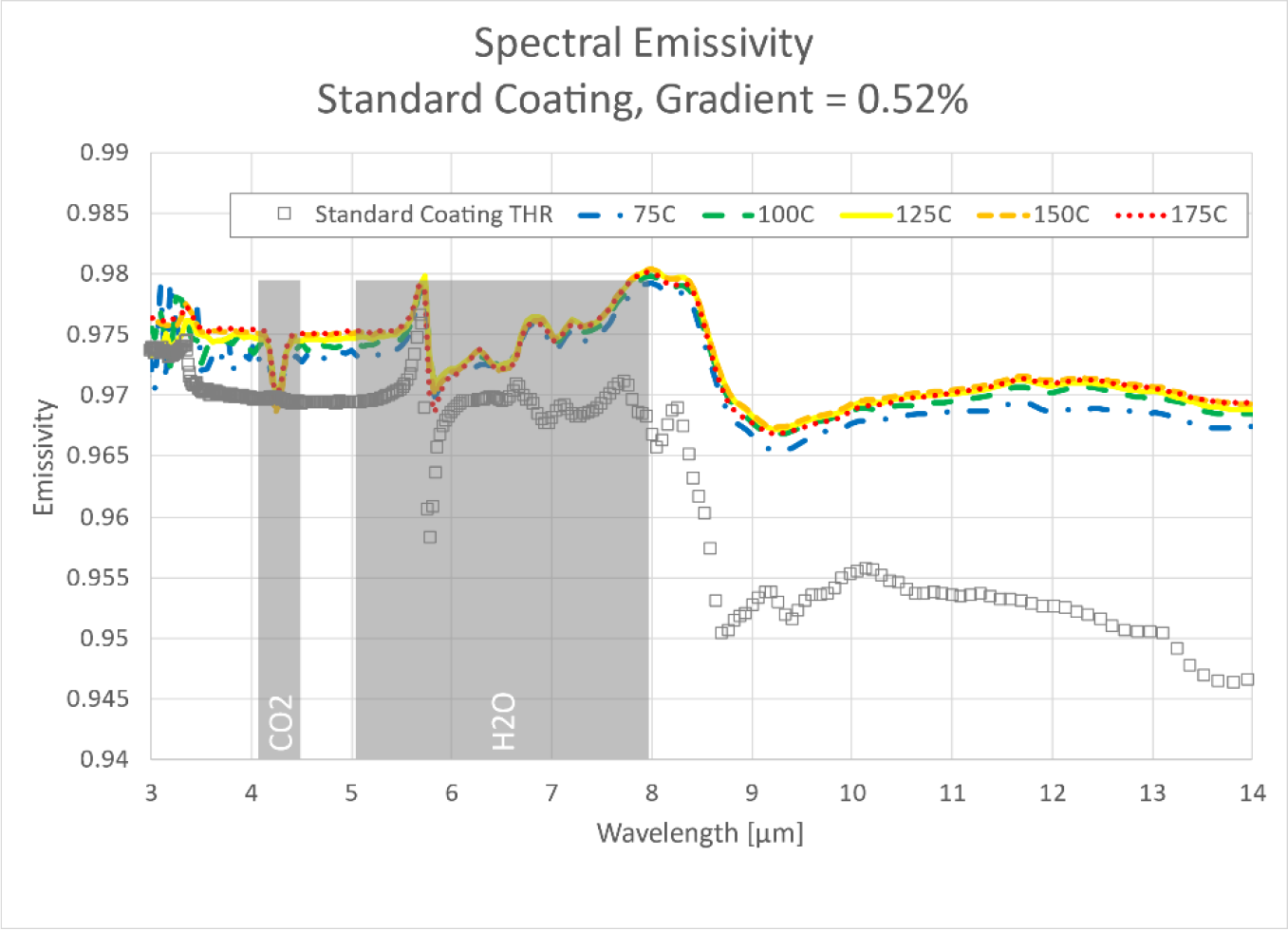 圖7:具有標準塗層的輻射源校準後的光譜發射率,並與THR量測推導值比較。