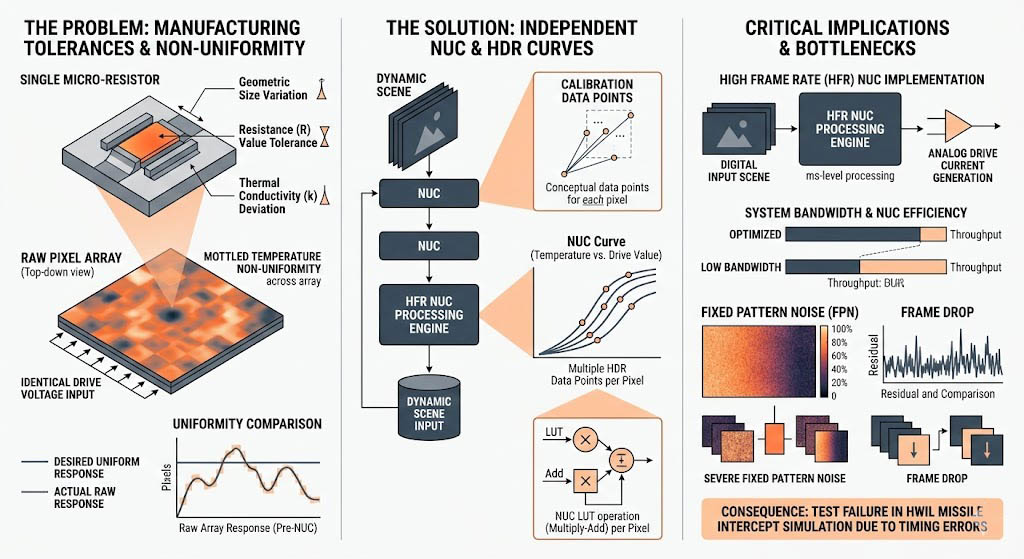 為了解決這個問題,系統必須對這一百萬個像素進行獨立的非均勻性校正(NUC),在實務上,要在涵蓋常溫到攝氏數百度的高動態範圍內,確保每一個像素都能線性且均勻地發光,系統必須為每一個像素建立包含多個資料點的校正曲線。當以極高幀率輸入未經處理的數位影像時,投影系統內部的控制電子設備必須在幾毫秒內,即時且毫無延遲地將畫面中的每一個像素值,套入對應的 NUC 查找表進行乘加運算,然後再轉換為精確的類比驅動電流。 如果測試系統的數位訊號處理架構頻寬不足,或是 NUC 演算法不夠精良,系統將無法在指定的幀率下完成龐大的資料傳輸,這會導致投影出的紅外線場景出現嚴重的固定圖案雜訊(Fixed Pattern Noise),或是發生幀數掉落(Frame Drop),這對於要求絕對即時同步的 HWIL 飛彈攔截模擬而言,將引發嚴重的時序錯亂與測試失敗。