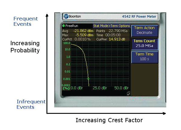 對於具有高波峰因數的低振幅通訊訊號,儘管在考量位元錯誤率 (BER, Bit Error Rate) 時相當重要,但其對於系統損壞的潛在風險更令人擔憂;與大功率峰值相關的高電壓可能在發射器系統中產生快閃或持續電弧,進而損毀元件,統計學是量測這些罕見事件的重要工具,瞬時功率值會依照大小而非出現時間進行排序,並且進行計數而非平均,此過程可以持續很長時間,僅受限於可用記憶體,或者在應用抽樣處理後可以無限期運行,這是一種評估事件的寶貴方法,例如:OFDM 訊號可能每天僅出現一次的最大峰值功率,運用統計資料擷取脈衝資料,可以提供在擷取振幅對時間量測時不易觀察到的額外洞察。