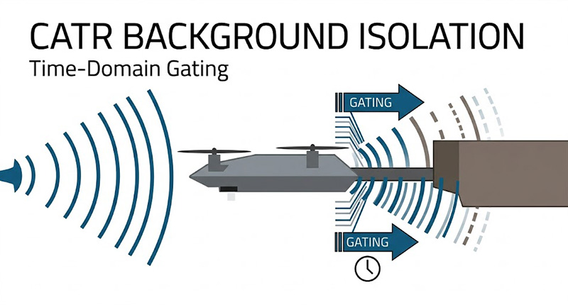 針對緊縮場(CATR)內的背景雜訊與支架干擾,我們的方案整合了具備脈衝量測(Pulsed System)與時域分析能力的高階向量網路分析儀,透過精確的時域閘控,系統能在發射射頻能量叢發(Bursts)後,於正確的時間點開啟接收器,將環境背景與掛架的強烈干擾訊號摒除於接收窗外,大幅提升動態範圍並精準萃取無人機的真實目標回波。