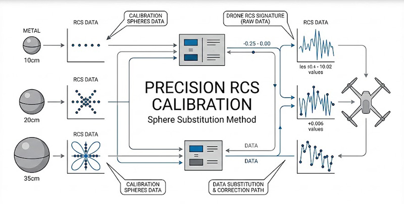 最後,為了解決替代校正法(Substitution Method)的基準漂移與微小誤差,我們提供標準化的高精密金屬校正球體套件(如 10 公分、20 公分、35 公分標準球),並內建自動化校正計算演算法。系統會自動扣除背景淨值能量,並利用嚴謹的比例公式(待測物 RCS = 標準球 RCS × (待測物量測能量 / 標準球量測能量))回推絕對數值,協助客戶符合 IEEE 1502 等嚴格量測規範,確保極低 RCS 匿蹤載具的量測可靠度。