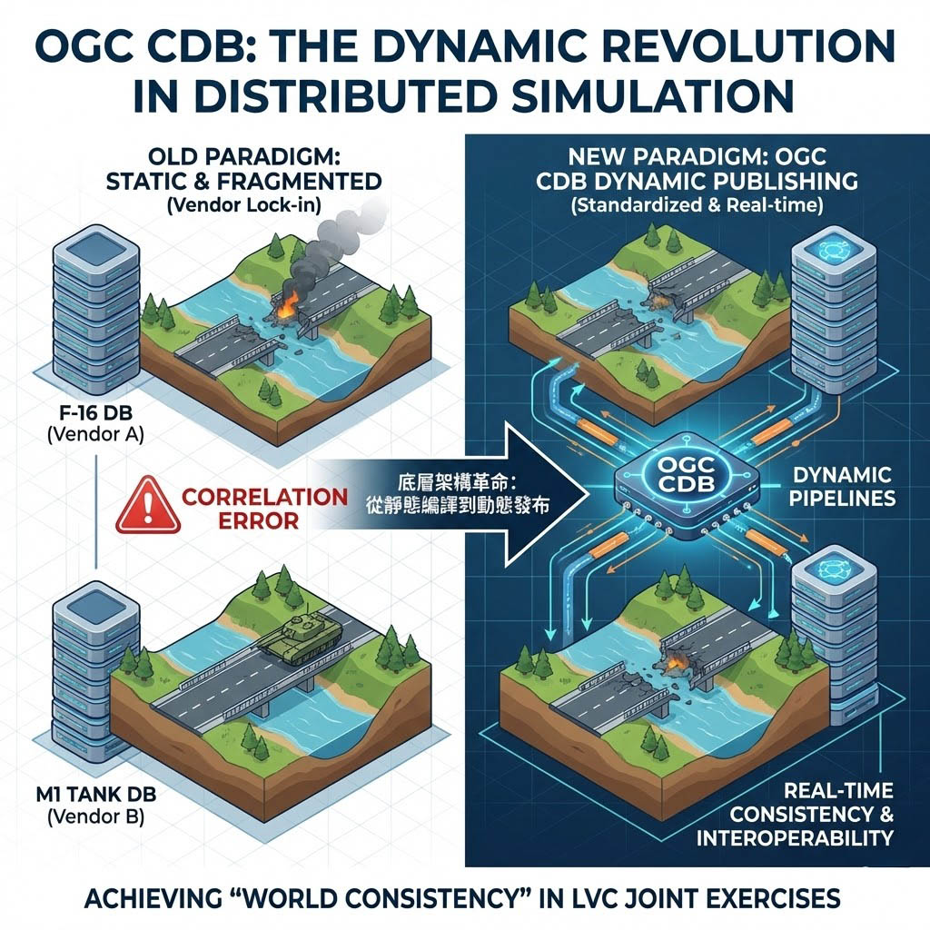 傳統的解決方案是強制所有模擬器使用同一家廠商的專有格式(如 OpenFlight 或 CTDB),這導致了嚴重的廠商鎖定(Vendor Lock-in)與更新遲滯,隨著 OGC CDB (Common Database) 標準的興起,模擬產業正經歷一場從「靜態編譯」到「動態發布」的底層架構革命。