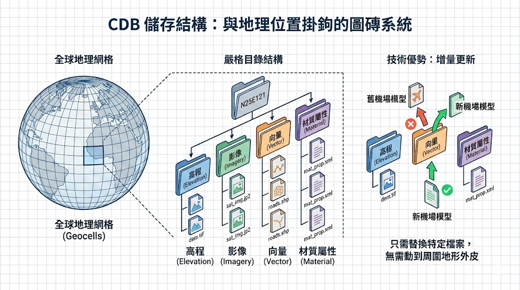 CDB 不像傳統格式將幾何模型與紋理混合打包,而是採用嚴格的目錄結構,它將地球劃分為經緯度網格(Geocells),並將高程、影像、向量與材質屬性分開儲存。