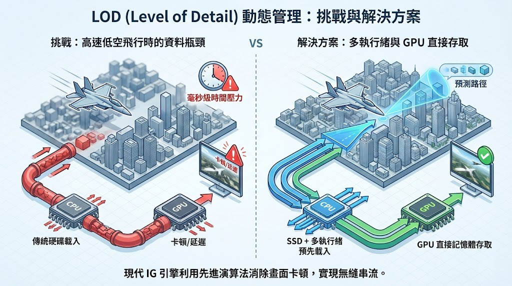 - 解決方案: 現代 IG 引擎利用多執行緒與 GPU 直接記憶體存取,在背景預先載入(Pre-fetch)預測路徑上的資料,消除畫面卡頓(Stutter)。