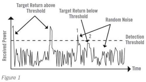 圖 1 顯示了一個來自脈衝雷達系統的典型返回訊號,其中包含了目標特徵(target signature)、隨機雜訊(random noise)以及確定性的虛假警報(deterministic false alarms),必須確定一個特定的閾值(threshold)來區分真實目標與雜訊,這個門檻的設定需要在偵測靈敏度與誤報率之間取得平衡,可被感測到的最小功率值相當於雷達接收機的最低可偵測訊號,必須計算此位準以確定系統的最大偵測距離。