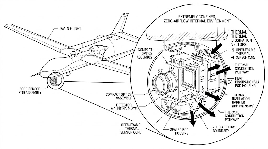 然而,這種嚴苛的 SWaP(體積、重量與功耗)限制,使得高階感測器的封裝與散熱面臨了極大的物理挑戰,傳統的封閉式工業級或實驗室級紅外線攝影機,其外殼與散熱鰭片佔據了過多的無效體積與重量,完全無法塞入現代輕量化無人機的酬載艙中,更致命的是,在這類高密閉的球型雲台或高空稀薄大氣環境中,幾乎不存在可用的冷卻氣流 (Cooling airflow) 來帶走史特林製冷機 (Stirling Cryocooler) 與驅動電路所產生的廢熱,若未能妥善處理熱管理,感測器的熱雜訊將急遽飆升,甚至導致設備停機。
