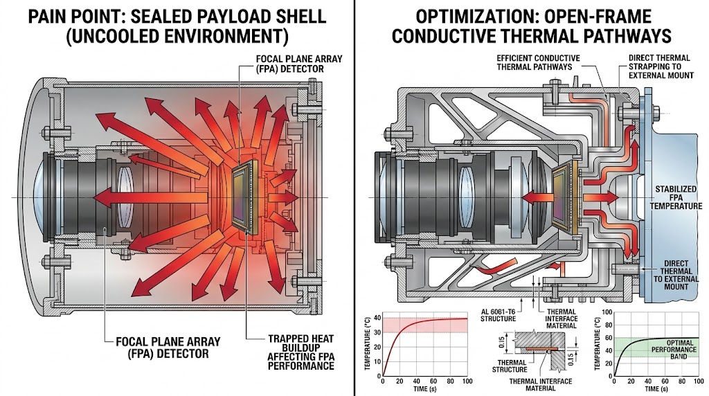 本圖對比酬載熱管理:密封外殼 (左) 導致熱堆積困在內部,影響焦平面陣列性能,優化開放式框架 (右) 透過傳導熱路徑將熱傳至外部,穩定溫度於最佳性能範圍。
