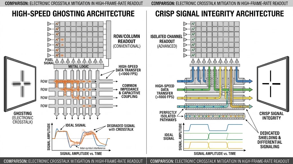 此示意圖比較高幀率讀出架構:左側傳統架構因共用阻抗與電容耦合,導致電荷溢出產生電子串擾與鬼影;右側先進架構利用隔離通道、專用遮蔽及差分訊號,確保電荷精確傳輸,於高速下維持清晰訊號完整性。
