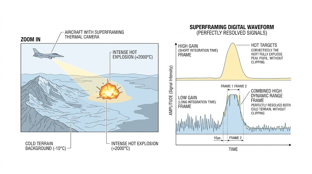 本技術示意圖展示「超級幀(SuperFraming)」技術在解決極端輻射對比動態範圍極限時的表現,左側為包含冷地形背景與高熱爆炸的複雜場景;右側波形圖詳細對比高增益(短積分時間)與低增益(長積分時間)幀,最終的組合幀能完美解析所有高低振幅訊號而不產生訊號截波(Clipping)。