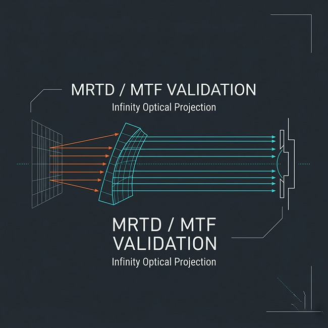 MRTD 是評估熱影像系統綜合熱靈敏度與空間解析度的終極量化指標;而 MTF 則定義了光學系統傳遞空間對比度的物理極限,為了在實驗室內安全且可重複地執行這些極限測試,工程師必須建構一套能夠精確模擬「無窮遠處、具備特定空間頻率與微小溫差之幾何目標」的光學投影環境,然而當無人機感測器的像素間距微縮至個位數微米 (µm) 且熱靈敏度逼近理論極限時,將這套龐大的光學模擬理論轉化為實體測試平台,測試工程師正面臨著三大難以妥協的物理與系統幾何難題。