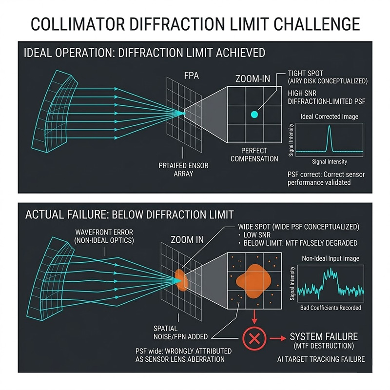 要在實驗室有限的空間內模擬位於無窮遠的敵方目標,測試系統必須依賴長焦距的「準直儀 (Collimator)」,將發散的熱輻射轉換為絕對平行的光束。 然而,若採用傳統的折射式透鏡準直儀,紅外線頻段的光子在穿透透鏡介質時,會產生嚴重的色散 (Chromatic Aberration) 與熱透鏡效應,導致不同波長的焦點無法重合。此外,為了涵蓋無人機光電球巨大的入瞳直徑,準直儀必須具備極大的清晰孔徑 (Clear Aperture),在這種大孔徑與長焦距的要求下,任何微觀的鏡面加工誤差,都會在平行光束中引入嚴重的波前像差 (Wavefront Error),若準直儀本身的光學品質無法達到嚴格的繞射極限,其產生的點擴散函數 (PSF) 展寬,將直接被待測感測器捕捉,並被錯誤解讀為「無人機鏡頭本身的解析度低下」,徹底摧毀 MTF 測試的客觀基準。