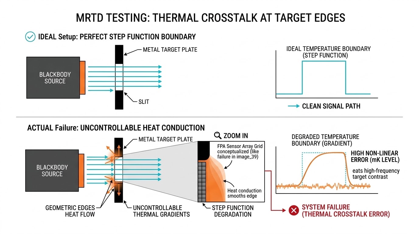 在執行 MRTD 測試時,系統需投射具備特定空間頻率(如奈奎斯特頻率)的「四條線 (4-Bar)」物理標靶,並控制標靶與背景之間的微小溫差 (ΔT),在傳統的發射式架構中,標靶金屬板直接被後方的高溫黑體烘烤,隨著空間頻率的增加,金屬板上鏤空的縫隙極度微小,根據熱力學傳導定律,黑體的強烈熱輻射會沿著金屬標靶的幾何邊緣產生不可控制的熱梯度與熱傳導,這導致原本應該是絕對銳利「階躍函數 (Step Function)」的溫度邊界,在熱物理上退化為平緩的漸層,這種設備自發性的「熱串擾」現象,會吃掉高頻目標的真實熱對比度,使得系統在量測毫開爾文 (mK) 等級的極限 MRTD 時,產生極大的非線性誤差。