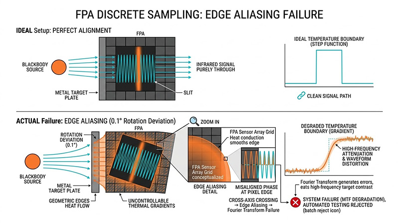 現代無人機焦平面陣列 (FPA) 本質上是一個離散的空間取樣系統,在進行狹縫響應函數 (SRF) 或 MTF 測試時,若測試標靶的幾何邊緣未能與感測器的像素網格達成絕對的平行對齊,將引發致命的「邊緣混疊」效應,只要標靶與感測器之間存在零點幾度的微小物理旋轉偏差,投射的高頻狹縫影像就會以錯位的相位跨越相鄰的感測器像素,這會導致傅立葉轉換 (Fourier Transform) 演算法在計算空間頻率響應時,產生嚴重的高頻能量衰減與波形扭曲,在缺乏高精度微調機構的測試治具中,工程師往往需要耗費數小時反覆手動敲擊或調整設備,試圖找回那消失的奈奎斯特頻率對比度,這使得自動化量產測試成為不可能的任務。