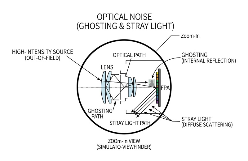 無人機內部的非均勻性校正(NUC)快門(Flag)與感測器周邊的冷屏,必須作為一個絕對的熱力學零點或均勻基準, 若這些元件表面的紅外線發射率未達完美(例如僅有 0.95),代表其具備高達百分之五的反射率,對於極度敏感的 LWIR 感測器而言,這百分之五的反射率會讓感測器「看見」自己陣列散發出的本底熱能,或是反射出電路板運作時的不均勻熱梯度,這種被稱為 鬼影效應(Narcissus Effect)的自我熱反射,會將虛假的幾何熱圖案投射至畫面上,當系統執行自動 NUC 校正時,這些因內部反射產生的幽靈熱梯度會被錯誤地寫入補償矩陣中,導致無人機在觀測平坦背景時,畫面上永遠存在著無法抹除的固定模式雜訊(FPN)。